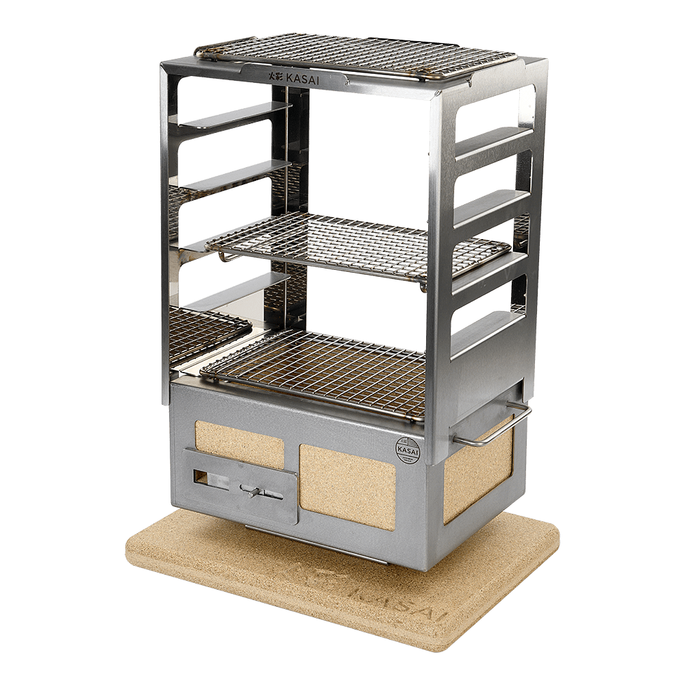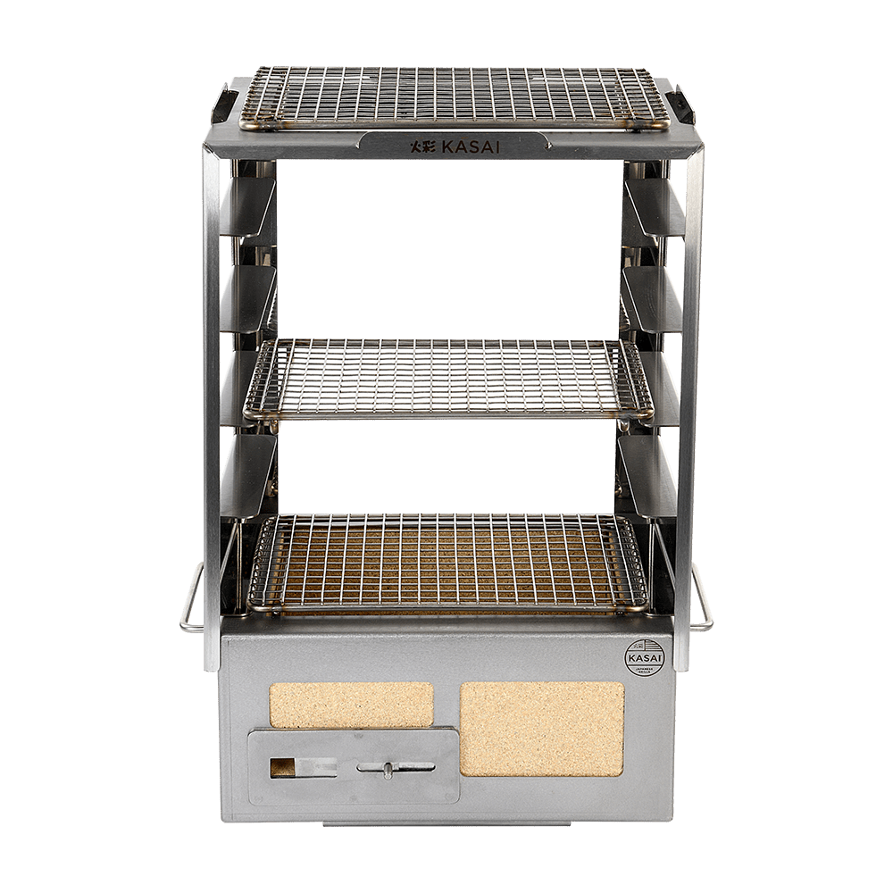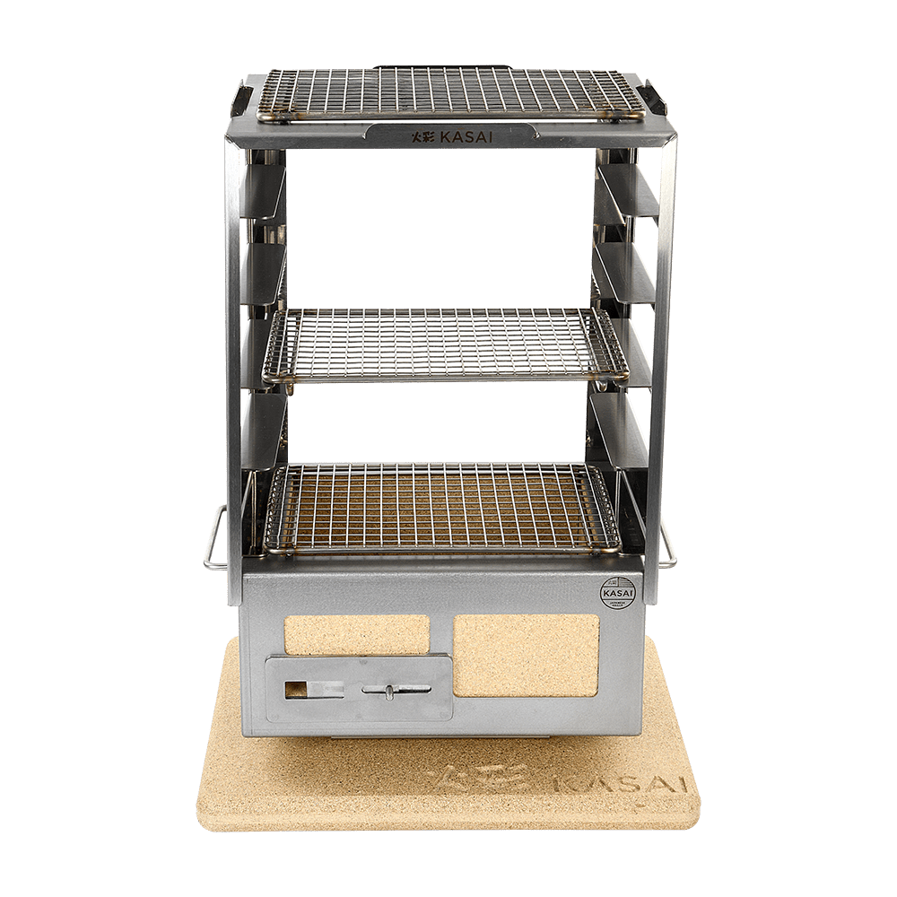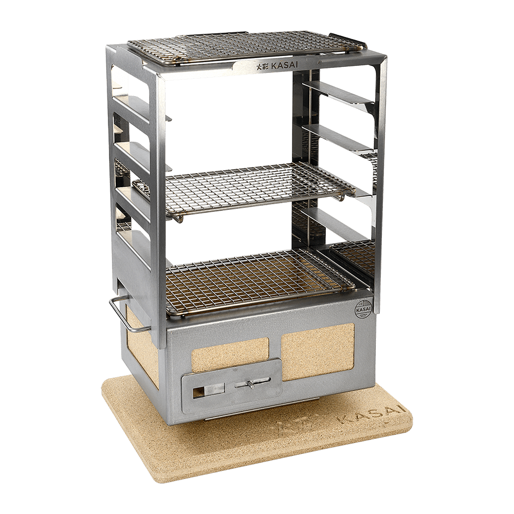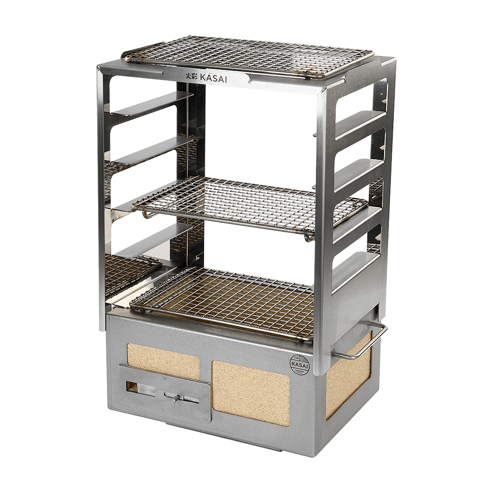 I stedet for bare å kontrollere temperaturen på Kasai-grillen, kan du nå justere avstanden mellom maten og varmen, slik at du kan hvile og tilberede en rekke forskjellige ingredienser samtidig.