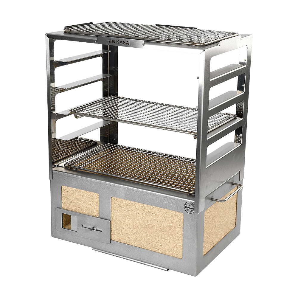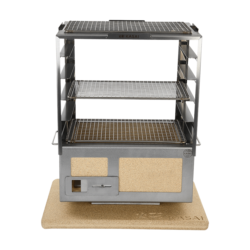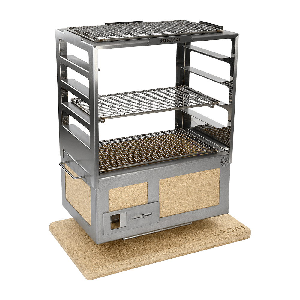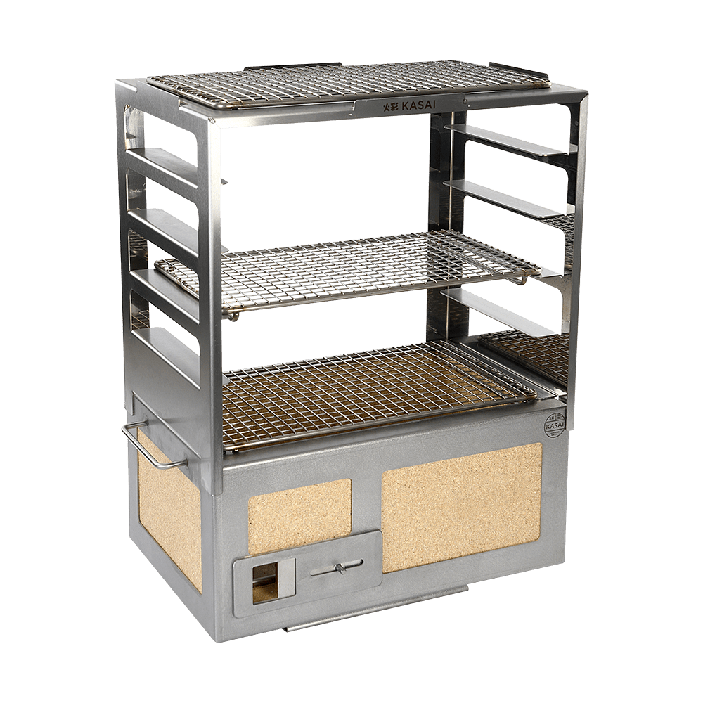 I stedet for bare å kontrollere temperaturen på Kasai-grillen, kan du nå justere avstanden mellom maten og varmen, slik at du kan hvile og tilberede en rekke forskjellige ingredienser samtidig.