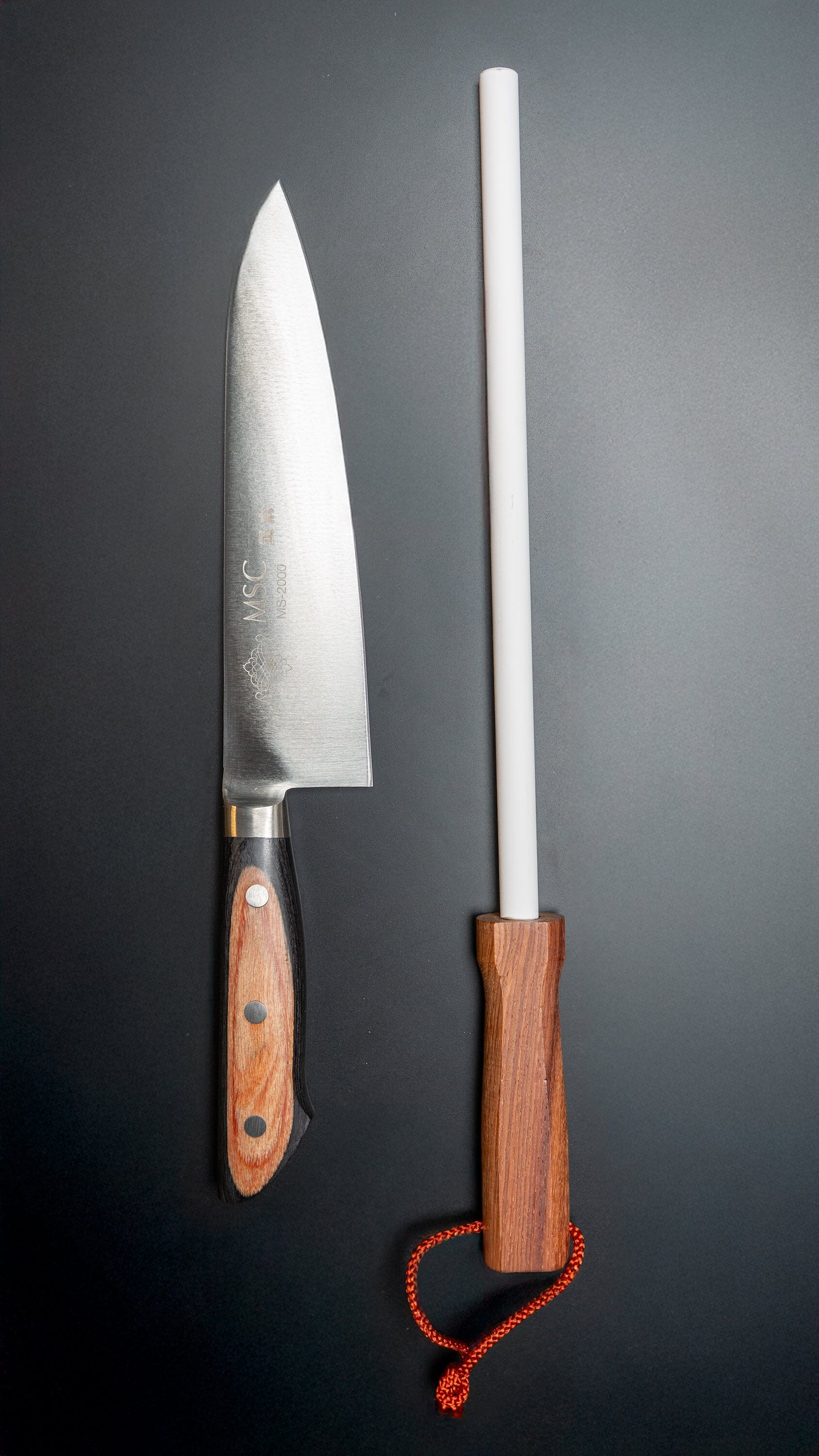 Inkludert i pakken: Masahiro brynestav 250 mm. En keramisk brynestav vi vanligvis anbefaler til våre kunder, perfekt for å holde kniven skarp i hverdagen.