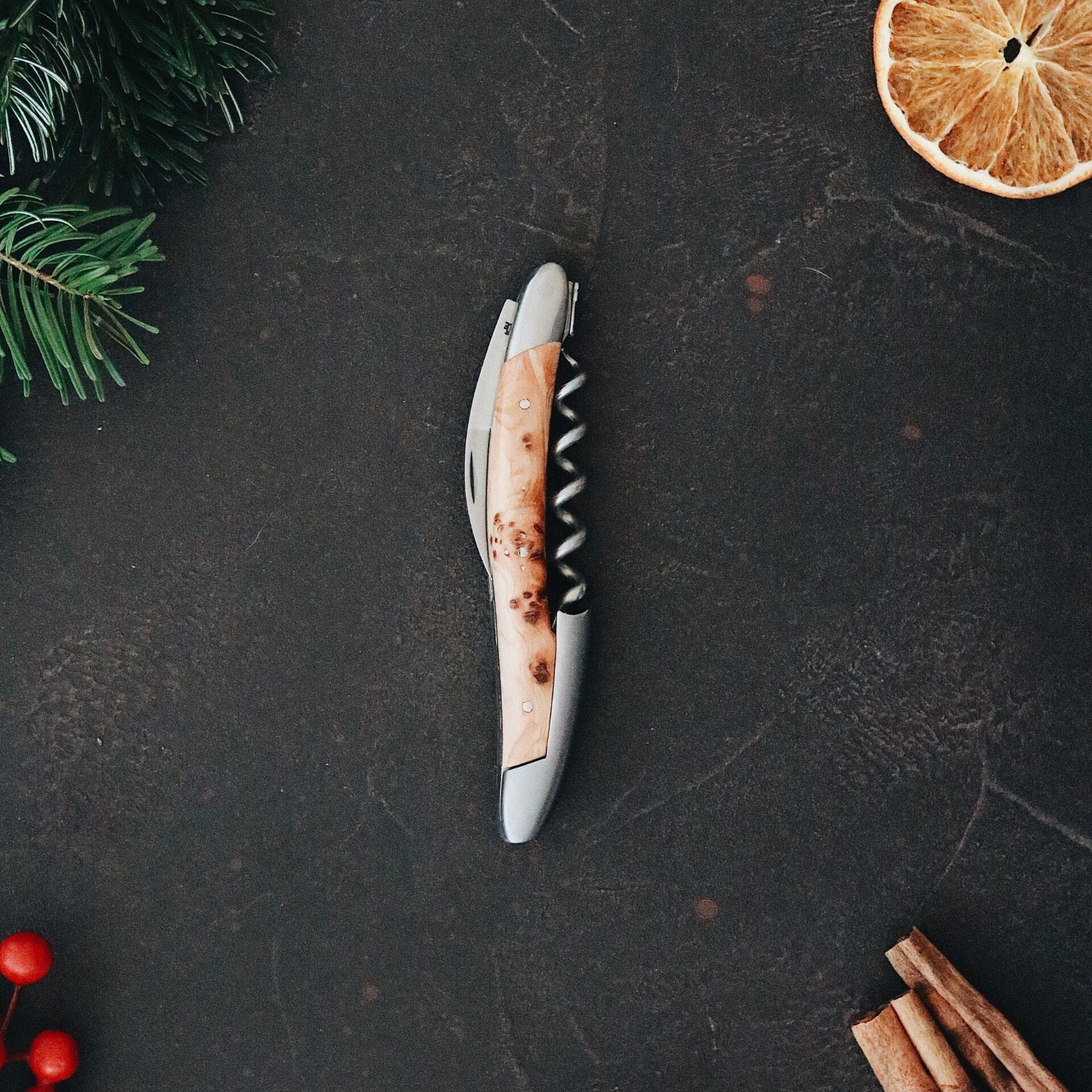 Leveres i eske med sort skinnveske og sertifikat.Har flaskeåpner. Materiale: Juniper wood, shiny. MERK! Alle vinåpnerene er håndlaget av naturlig materiale og utseendet vil variere i farge, årring, korn fra en gjenstand til en annen.