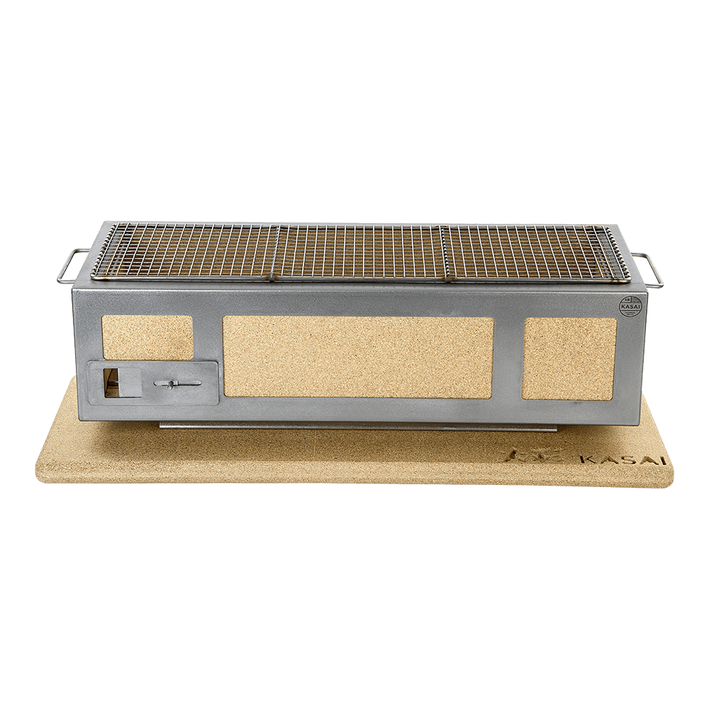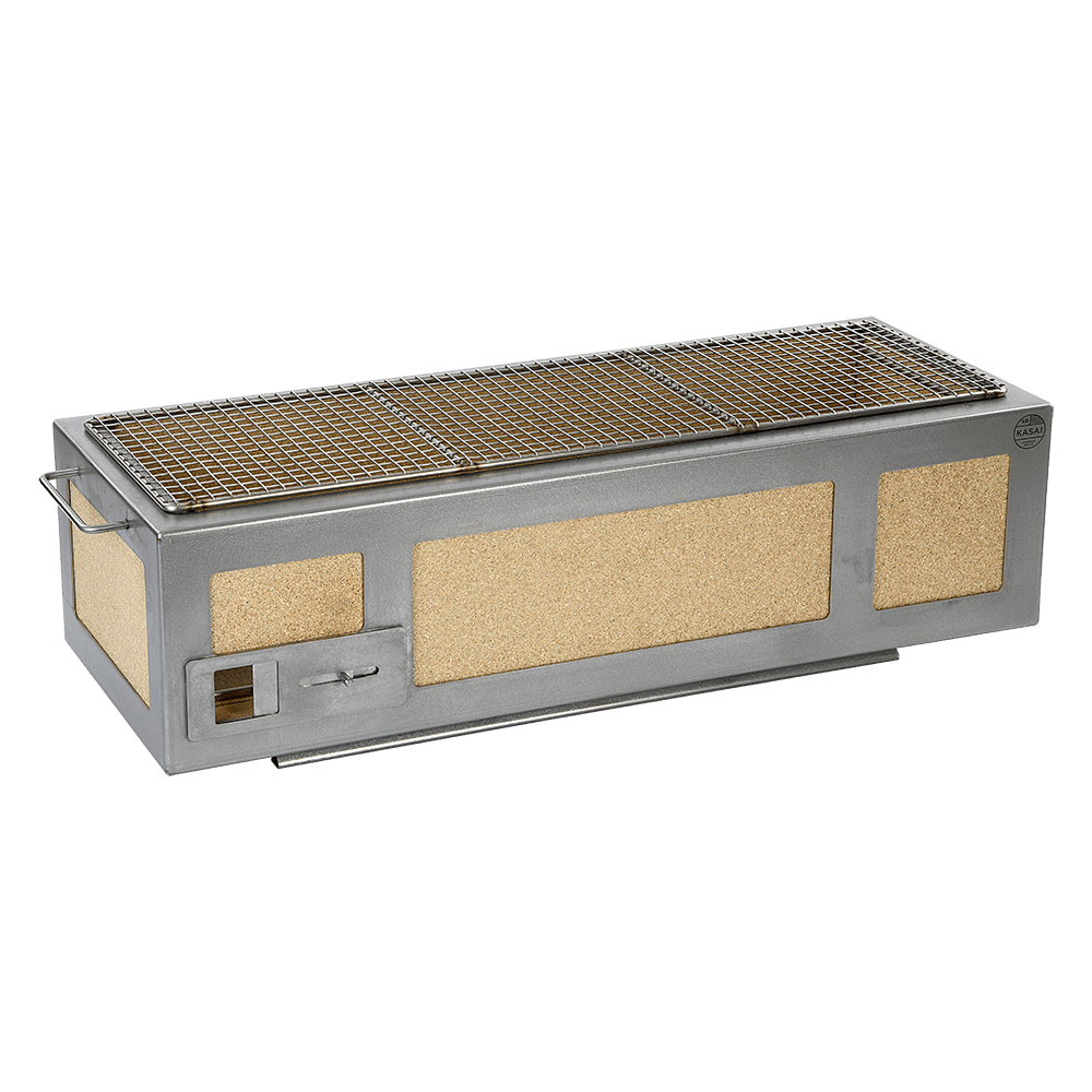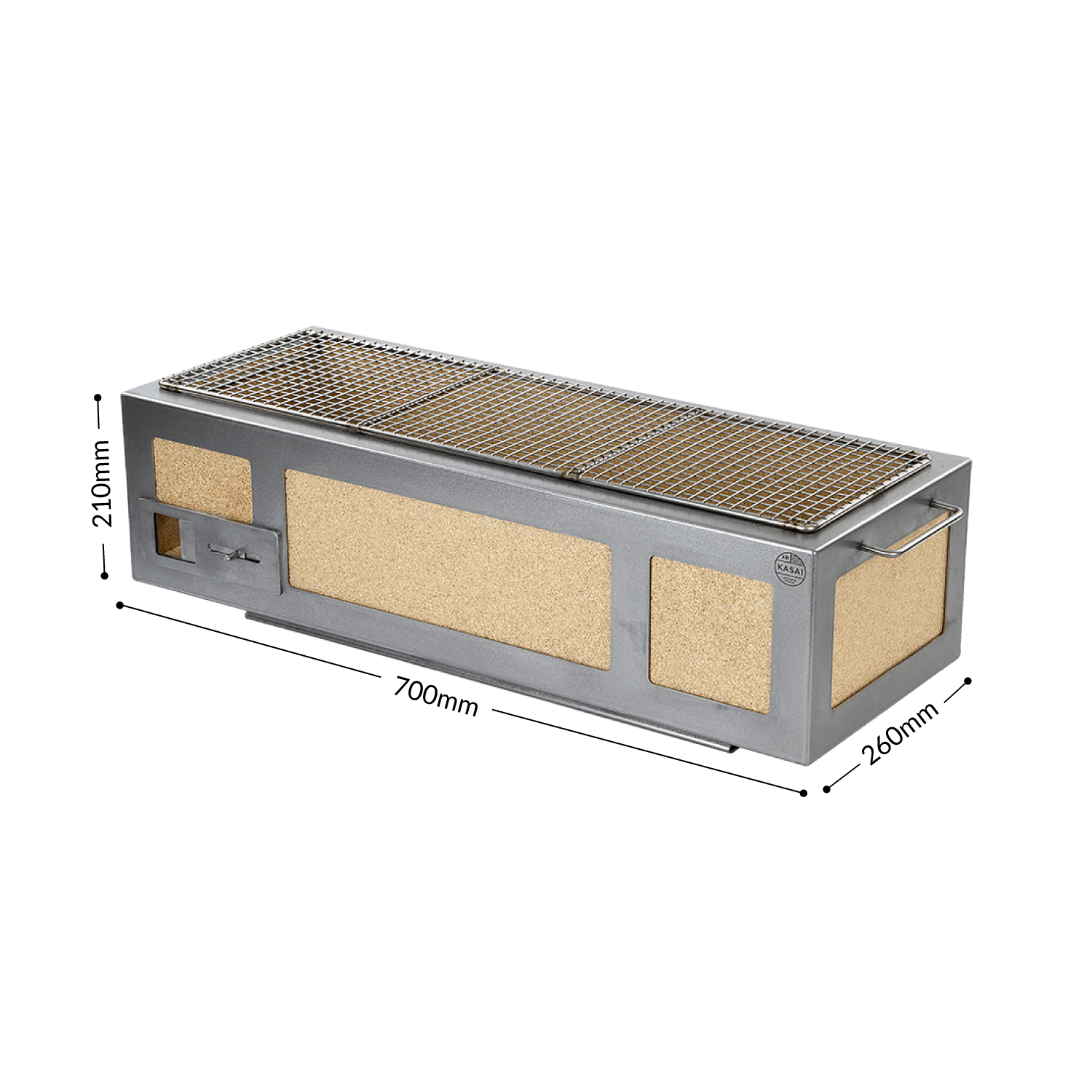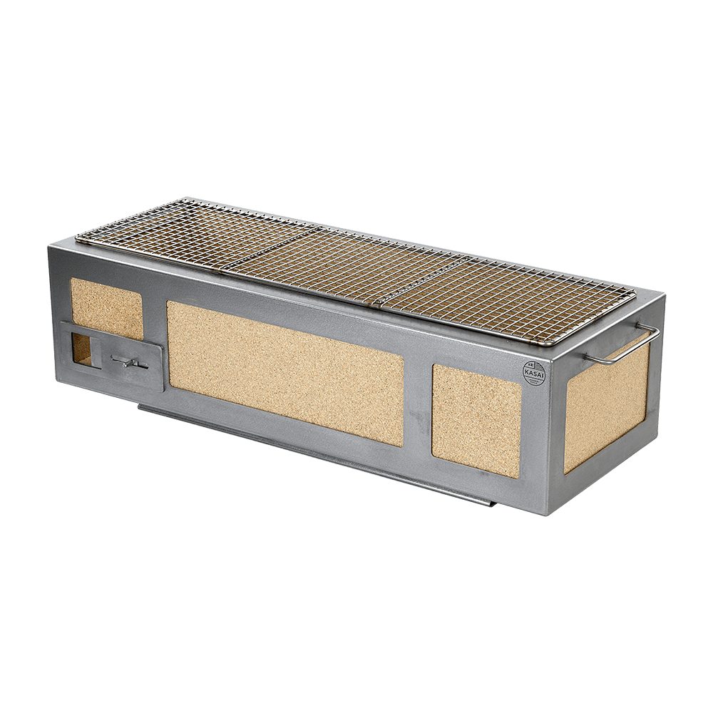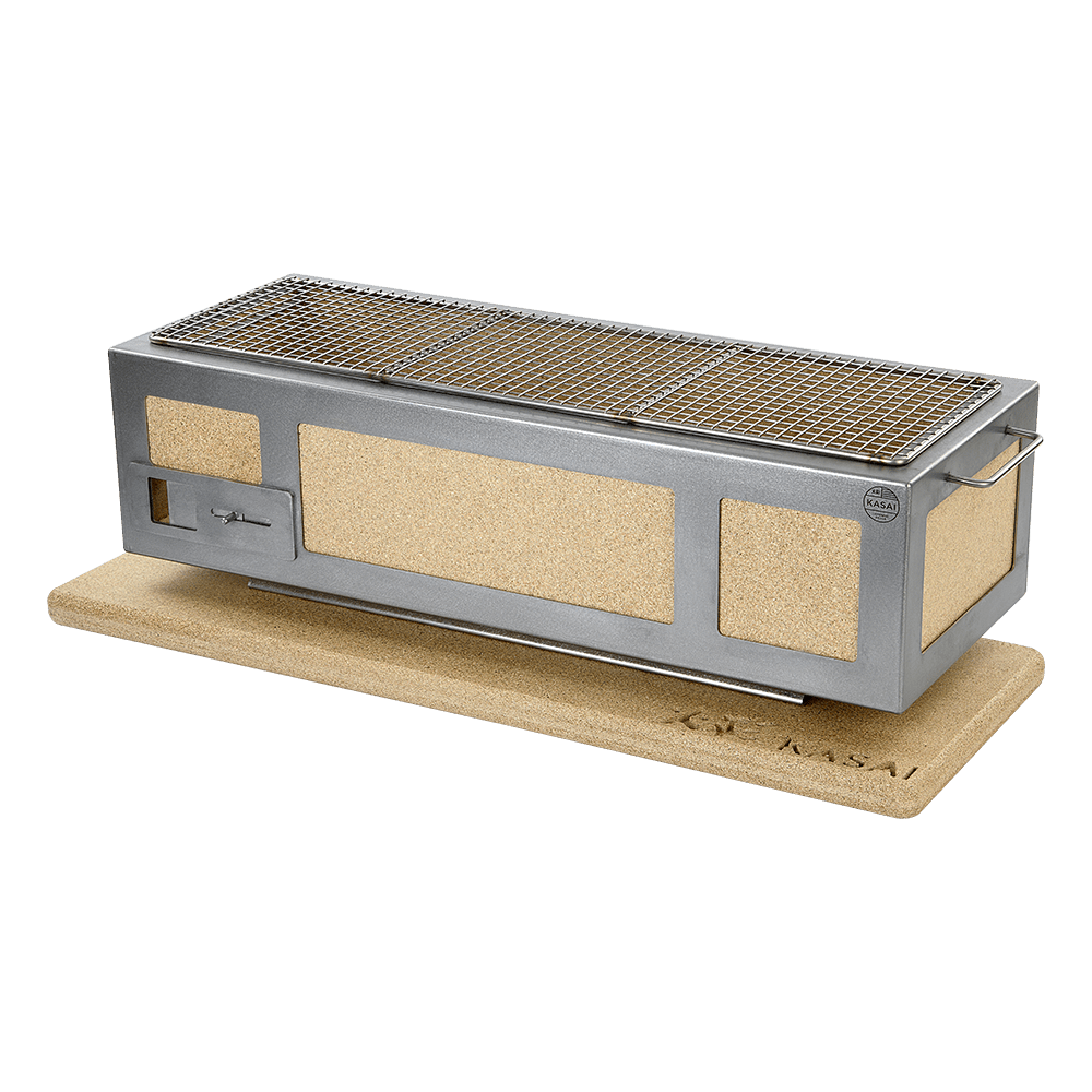 Den lange Kasai Konro-grillen kombinerer japansk grilltradisjon med moderne, britiskprodusert kvalitet. Med børstet stålfinish, flytende føtter, bærekraftige mineralfliser og praktiske håndtak, er dette en grill som leverer både estetikk og funksjon.